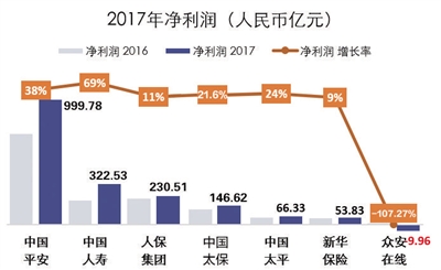 根據(jù)業(yè)績報告統(tǒng)計:截至2017年底,7家上市保險公司凈利潤總計1810億元。其中,中國平安的凈利潤最高達(dá)999.78億元,眾安在線是惟一一家凈利潤為負(fù)的公司,為-9.96億元。上市保險公司凈利潤大增的“功臣”是表現(xiàn)不俗的投資收益。