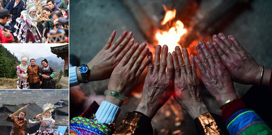 照片:右圖從左至右依次為吳妹烏、父親吳成新、母親梁妹恩一家三人的手(1月17日攝);左上圖為吳妹烏參加苗寨苗年坡會的拔河比賽(1月17日攝);左中圖為吳妹烏和父母合影(1月17日攝);左下圖為吳妹烏和父親吳成新在一起吹蘆笙(1月17日攝)。