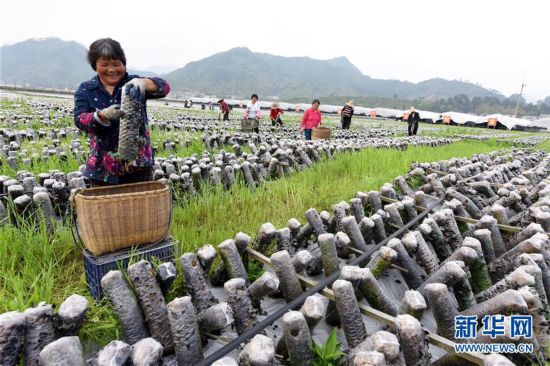 4月3日,上饒縣鄭坊鎮(zhèn)洲村村的姜水榮(左一)等貧困戶(hù)在采收黑木耳。