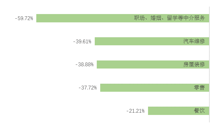 兩會(huì)召開期間(3月3日至3月20日),全國(guó)價(jià)格舉報(bào)受理量保持平穩(wěn),市場(chǎng)價(jià)格秩序良好。其中,民生服務(wù)類價(jià)格問題受理案件與歷史同期相比減少33.03%,與上月相比減少23.46%。其中,同比下降最多的五個(gè)行業(yè)是職場(chǎng)婚姻留學(xué)等中介服務(wù)、汽車維修、房屋裝修、商品零售與餐飲,跌幅分別為-59.72%、-39.61%、-38.88%、-37.72%、-21.21%。