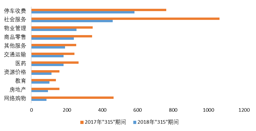 從熱點(diǎn)行業(yè)分布來看,“3·15”期間停車收費(fèi)、社會(huì)服務(wù)、物業(yè)管理、商品零售等行業(yè)位居前列;與2017年同期相比,網(wǎng)絡(luò)購物、社會(huì)服務(wù)和房地產(chǎn)等行業(yè)受理量下降幅度較大。
