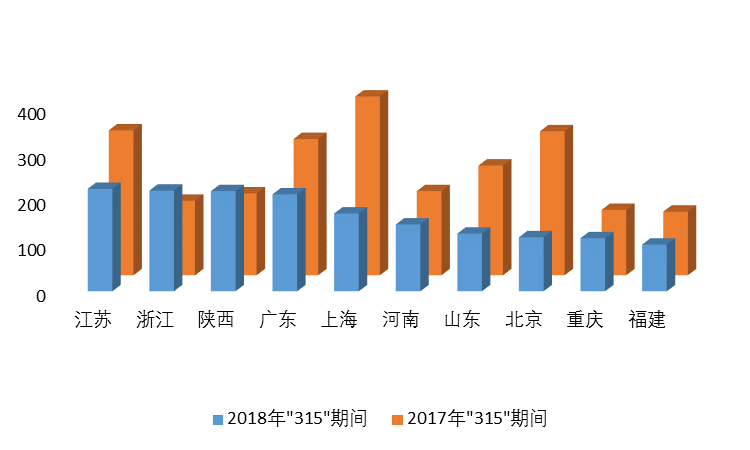 從地區(qū)受理量來看,和近兩年“3·15”期間平臺(tái)受理數(shù)據(jù)對(duì)比發(fā)現(xiàn),江蘇、上海、北京和廣東等地受理量均較去年同期下降明顯,浙江、陜西、河北和四川等地受理量均較去年有所增長(zhǎng)。