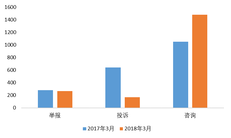 報(bào)告顯示,2018年3月平臺(tái)共受理價(jià)格舉報(bào)、投訴、咨詢共計(jì) 51432件,環(huán)比上升12.9%,同比下降40.5%,主要是由于網(wǎng)購行業(yè)舉報(bào)受理量同比下降85%。其中,價(jià)格舉報(bào)6941件,環(huán)比上升20%;價(jià)格投訴5091件,環(huán)比上升0.4%;價(jià)格咨詢39400件,環(huán)比上升13.5%。