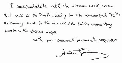 6月15日,人民日報(bào)將迎來創(chuàng)刊70周年紀(jì)念。當(dāng)?shù)孟と嗣袢請?bào)、人民網(wǎng)、人民日報(bào)“兩微兩端”等全媒體平臺(tái)超過7億的受眾,將通過文字和視頻分享他的見解時(shí),古特雷斯非常開心,“這是我所見過的最大平臺(tái)了”。他欣然為人民日報(bào)題詞:“謹(jǐn)向人民日報(bào)創(chuàng)刊70周年致以最熱忱的祝賀。感謝貴報(bào)全體員工為中國人民提供的卓越服務(wù)!保ㄈ鐖D二)