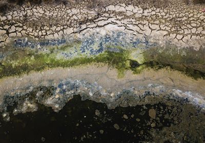 圖為2018年3月30日在江蘇連云港燕尾港鎮(zhèn)化工園區(qū)內(nèi)拍攝的一處水塘,離海一堤之隔的池塘水和岸灘“五顏六色”。記者 李響 攝