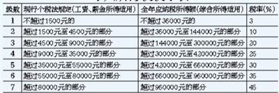 修正案草案將工資、薪金,勞務報酬,稿酬和特許權使用費等4項勞動性所得(下稱“綜合所得”)納入綜合征稅范圍,適用統(tǒng)一的超額累進稅率。綜合所得適用3%至45%的超額累進稅率。