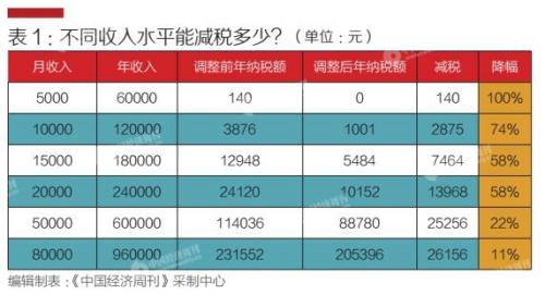 總體而言,月收入5000元以下的納稅人將不需要繳納個(gè)稅,稅負(fù)降幅為100%,月收入為8萬(wàn)元的納稅人,年納稅額的降幅超過(guò)10%。