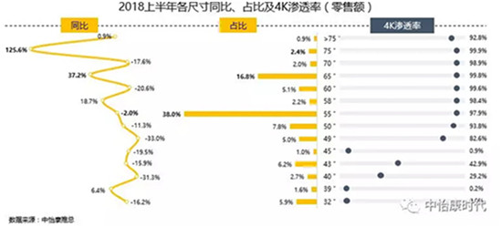 據(jù)中怡康推總數(shù)據(jù),2018上半年,55英寸電視穩(wěn)居第一大尺寸,零售額占比達(dá)到38%;65英寸占比16.8%,躍升為第二大尺寸。與此同時(shí),65、75英寸大屏電視消費(fèi)釋放出強(qiáng)勁活力,65英寸電視同比增長37.2%,75英寸電視同比增長高達(dá)125.6%,用戶對于大屏彩電的消費(fèi)熱度大幅提高。