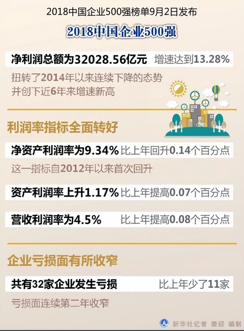 從榜單上看,利潤率指標全面轉(zhuǎn)好。2018中國企業(yè)500強凈資產(chǎn)利潤率為9.34%,比上年回升0.14個百分點。這是這一指標自2012年以來的首次回升。