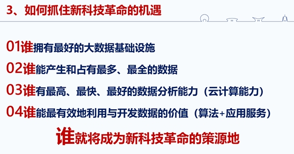 這一次新的科技革命,誰(shuí)成為它的策源地,誰(shuí)就會(huì)成為科技強(qiáng)國(guó),這個(gè)也是十九大習(xí)近平總書(shū)記給我們提出的要求,到2050年中國(guó)要成為科技強(qiáng)國(guó)。要想成為科技策源地主要的競(jìng)爭(zhēng)將會(huì)在四個(gè)層面展開(kāi):第一,誰(shuí)擁有最好的大數(shù)據(jù)基礎(chǔ)設(shè)施;第二,誰(shuí)能產(chǎn)生和占有最多、最全的數(shù)據(jù);第三,誰(shuí)有最高、最快、最好的數(shù)據(jù)分析能力;第四,誰(shuí)能最有效地利用與開(kāi)發(fā)數(shù)據(jù)的價(jià)值,假如在這四個(gè)層面我們?nèi)梢灶I(lǐng)先世界,我們就是新的科技革命的策源地。