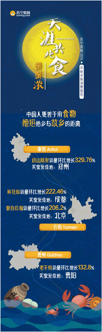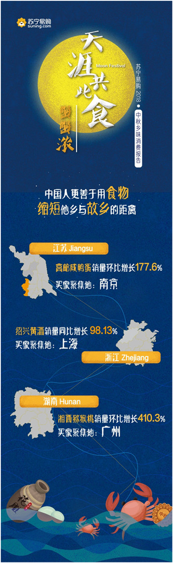如今,大閘蟹已經(jīng)成為人們中秋餐桌上的標(biāo)配。今年4月,蘇寧生鮮與陽澄湖大閘蟹協(xié)會展開戰(zhàn)略合作,蘇寧線上自營的大閘蟹全部都來自陽澄湖。9月以來,蘇寧易購大閘蟹的銷量同比增長為1821%,南京、上海、北京、廣州、沈陽成為“最敢吃螃蟹”的城市,4兩公蟹3兩母蟹的組合最受消費者歡迎。此外,蘇寧易購花雕酒的銷量也同比增長83.5%,數(shù)據(jù)顯示,上海和杭州人最愛吃花雕醉蟹。
