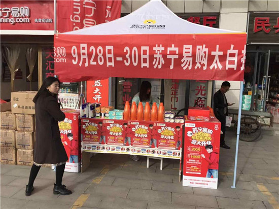 9月21日,蘇寧易購電商扶貧實(shí)訓(xùn)店在陜西省寶雞市盛大開業(yè),現(xiàn)場人頭攢動(dòng),場面火爆。太白店開業(yè)3天,預(yù)計(jì)銷售30萬元營業(yè)額,預(yù)計(jì)全年銷售額300萬,預(yù)計(jì)全年盈利30萬,蘇寧將拿出盈利部分的70%的利潤,捐贈(zèng)給當(dāng)?shù)刈龃壬啤H绻麑?shí)訓(xùn)店虧損,由蘇寧全部承擔(dān)。