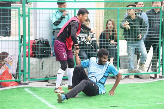 下半場更是熱血沸騰,比賽進(jìn)入了白熱化階段。但外國戰(zhàn)隊(duì)Pilucas成員摔倒后,對(duì)手卻立即上前扶起。