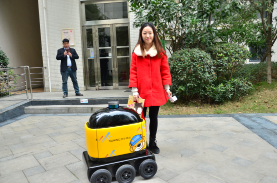 (蘇寧小店工作人員將商品放進(jìn)“臥龍一號(hào)”無(wú)人車)