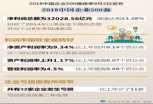 新華社西安9月2日電(記者許晟 張駿賀)2018中國企業(yè)500強榜單2日在西安發(fā)布,500強企業(yè)凈利潤總額為32028.56億元,增速達到13.28%,扭轉了2014年以來連續(xù)下降的……