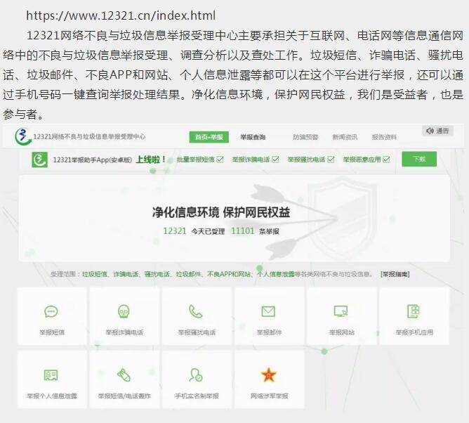 12321網(wǎng)絡(luò)不良與垃圾信息舉報(bào)受理中心主要承擔(dān)關(guān)于互聯(lián)網(wǎng)、電話網(wǎng)等信息通信網(wǎng)絡(luò)中的不良與垃圾信息舉報(bào)受理、調(diào)查分析以及查處工作。垃圾短信、詐騙電話、騷擾電話、垃圾郵件、不良APP和網(wǎng)站、個(gè)人信息泄露等都可以在這個(gè)平臺(tái)進(jìn)行舉報(bào),還可以通過手機(jī)號(hào)碼一鍵查詢舉報(bào)處理結(jié)果。凈化信息環(huán)境,保護(hù)網(wǎng)民權(quán)益,我們是受益者,也是參與者。