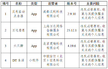 三、貝利自動(dòng)點(diǎn)擊器、萬(wàn)達(dá)普惠等4款A(yù)pp違反必要原則,收集與其提供的服務(wù)無(wú)關(guān)的個(gè)人信息(詳見(jiàn)下表)。