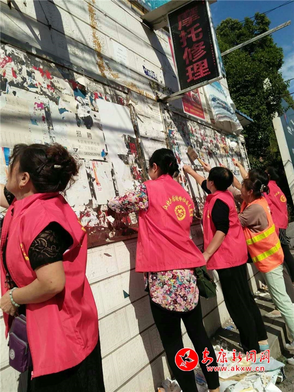 后張嶺社區(qū)組織志愿者、低保戶和保潔員對(duì)轄區(qū)的小野廣告進(jìn)行集中清理。