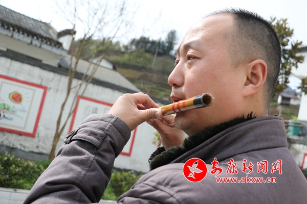 2017年,村上給胡珂和楊先彩在學(xué)校協(xié)調(diào)了兩間房子作為他們的宿舍,閑暇時(shí)胡珂會(huì)拿起心愛的笛子在學(xué)校的操場(chǎng)上演奏一曲,悠揚(yáng)的笛聲回蕩在村子的上空,其中也寄托著胡珂對(duì)妻兒的想念。實(shí)習(xí)記者 滕靜 攝