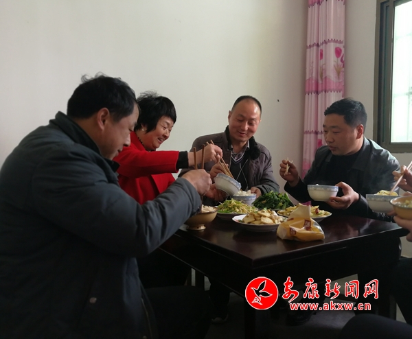 中午吃飯一般都是幾個(gè)素菜,和村上干部一起邊吃邊聊。楊先彩做過手術(shù),飯量小,經(jīng)常把飯撥給胡珂。記者 陳俊 攝