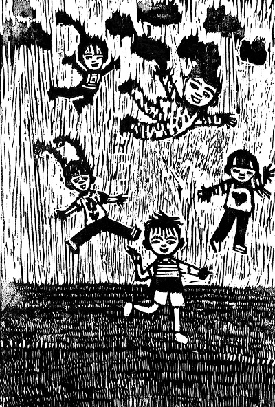 縣河鎮(zhèn)九年制學(xué)校一年級(jí)學(xué)生胡天佑的作品《兄弟倆比賽》生動(dòng)記錄了他和小伙伴一起玩滑板車的快樂(lè)時(shí)光。“每天放學(xué)我們都會(huì)在社區(qū)廣場(chǎng)玩滑板車,我就把它畫下來(lái)了。”胡天佑稚嫩的聲音里滿是自豪。同樣是一年級(jí)的張紫涵則創(chuàng)作了《漂亮的小姑姑》,“老師說(shuō)畫一畫自己最喜歡的人,我最喜歡小姑,就畫下來(lái)了。”這兩個(gè)孩子原本都不是版畫社團(tuán)成員,但因?yàn)檎宫F(xiàn)出繪畫天賦,被老師特別指導(dǎo)參與創(chuàng)作。