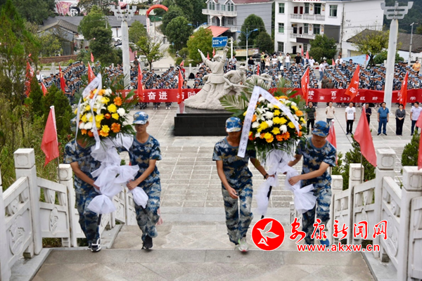 在戰(zhàn)斗紀(jì)念碑前,大家集體默哀,并向烈士敬獻(xiàn)花籃。講解員生動(dòng)講述著牛蹄嶺的戰(zhàn)斗事跡,在場(chǎng)的每一位仿佛回到了那個(gè)戰(zhàn)火紛飛的年代,真切感受到革命先烈不怕犧牲、甘于奉獻(xiàn)的紅色精神。隨后,校黨總支副書記徐信濤作了題為“賡續(xù)紅色基因,肩負(fù)祖國(guó)未來(lái)”的報(bào)告。徐書記從18歲烈士陳祥榕以身護(hù)國(guó)講到東京奧運(yùn)會(huì)上14歲少女全紅嬋為國(guó)爭(zhēng)光,再到習(xí)近平總書記來(lái)陜考察對(duì)青年學(xué)生的深切寄語(yǔ),希望同學(xué)們?cè)诟咧行缕瘘c(diǎn)上,扣好人生的“第一?圩”,立大志,明大德,成大才,擔(dān)大任,以自己的優(yōu)異成績(jī)告慰革命先烈,以自己的優(yōu)異表現(xiàn)實(shí)現(xiàn)強(qiáng)國(guó)夢(mèng)想。接著,在高一年級(jí)郭紅梅老師的帶領(lǐng)下,全體學(xué)生面對(duì)紀(jì)念碑莊嚴(yán)宣誓,錚錚誓言,清澈響亮,無(wú)不透露出新時(shí)代少年報(bào)效祖國(guó)的堅(jiān)定信心。