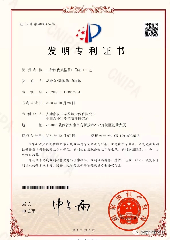 近日,由安康秦漢古茶發(fā)展股份有限公司和中國(guó)農(nóng)業(yè)科學(xué)院茶葉研究所聯(lián)合申報(bào)的發(fā)明專利“一種漢代風(fēng)格茶葉的加工工藝”獲得國(guó)家知識(shí)產(chǎn)權(quán)局授權(quán)(專利號(hào):ZL201811238852.9),自此安康最早的茶有了法律保障(專利法)。