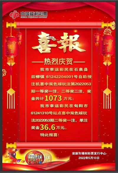 據(jù)檢索,一等獎中出站點位于石泉縣后柳鎮(zhèn)三角路口可明商店61242204001號自助投注機(jī)。這張彩票是12日下午購買的,購彩者當(dāng)時花費6元購買了一張6+3的自選小復(fù)式彩票,攬獲一等獎1注1000萬元,二等獎2注共73萬元,獎金合計1073萬元。另一個中出二等獎的福彩站點位于旬陽市華聲大廈61241310號投注站,獲獎彩民購買的是一張14元的7+1的復(fù)式自選彩票,喜中二等獎1注36.6萬元。