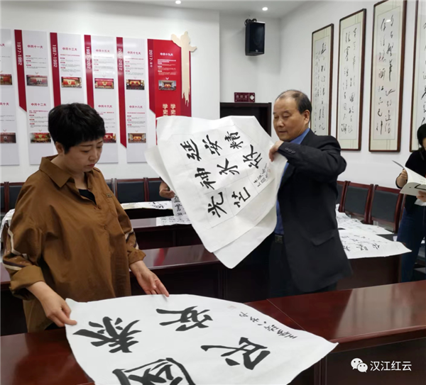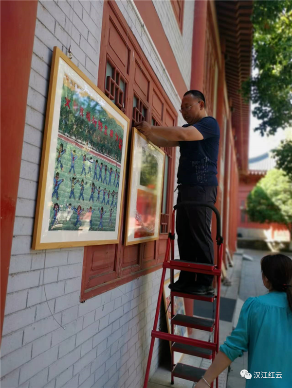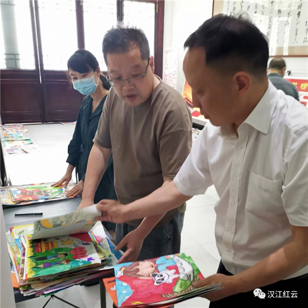 美術(shù)組的老師們?cè)谧屑?xì)篩選作品。