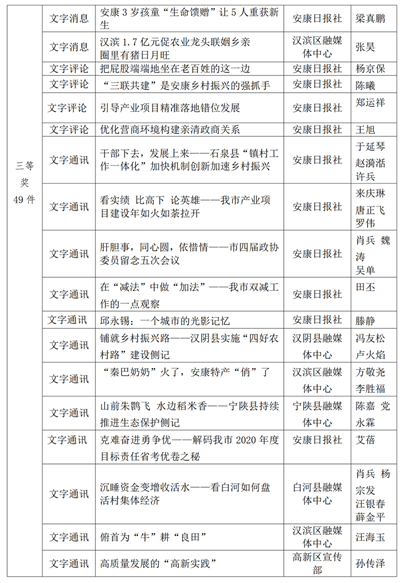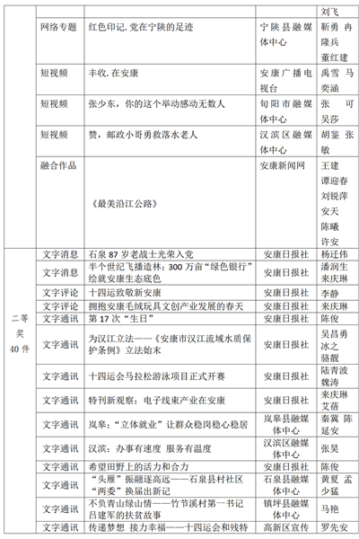 獲得本次安康新聞獎作品共計114件,其中一等獎25件(報紙類10件,電視廣播類10件,新媒體類5件)、二等獎40件(報紙類15件,電視廣播類15件,新媒體類10件)、三等獎49件(報紙類20件,電視廣播類16件,新媒體類13件)。張俊等16名同志獲得安康市優(yōu)秀新聞工作者稱號。從評選的范圍、內(nèi)容、體裁、形式等方面看,都好于往年。