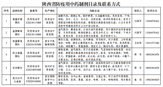 一是全市具有相關(guān)調(diào)劑品種使用需求且符合資質(zhì)的醫(yī)療機(jī)構(gòu)均可從《陜西省防疫用中藥制劑目錄及聯(lián)系方式》(詳見(jiàn)附件)中的醫(yī)療機(jī)構(gòu)購(gòu)進(jìn)目錄中的13種制劑產(chǎn)品,調(diào)劑使用時(shí)間從發(fā)文之日起至 2023年6月30日。