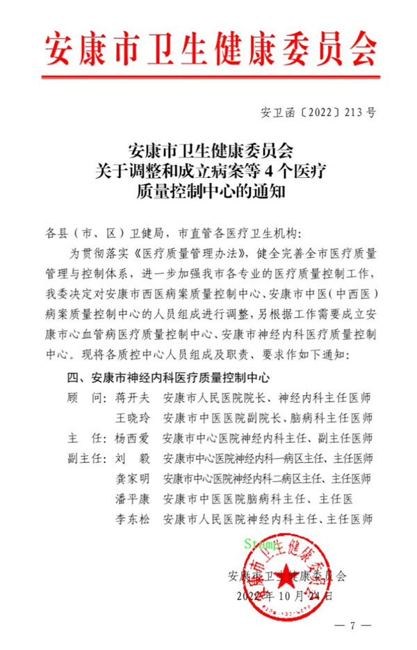 10月24日,市衛(wèi)健委成立安康市神經(jīng)內(nèi)科醫(yī)療質(zhì)量控制中心,掛靠腦科醫(yī)院。楊西愛為中心主任。