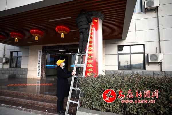 圖為該站干部職工在機(jī)關(guān)樓下貼春聯(lián)