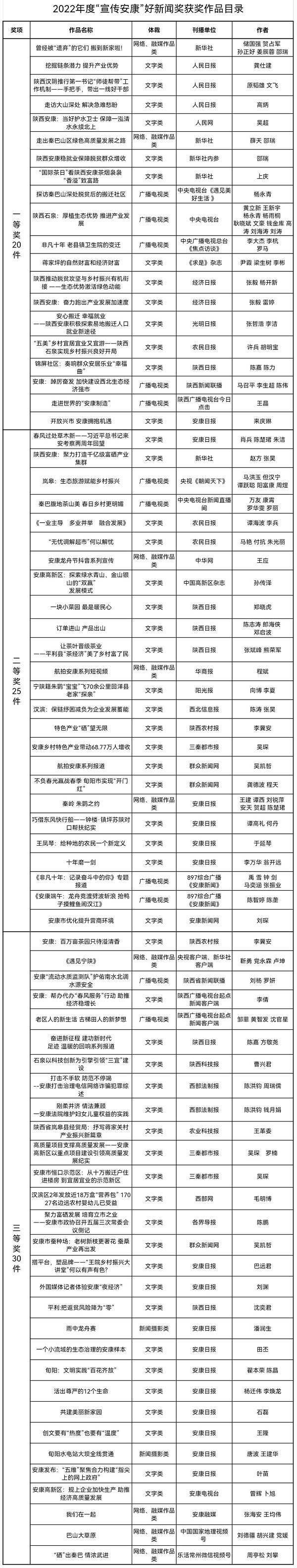 為充分發(fā)揮“宣傳安康”優(yōu)秀新聞作品示范作用,進一步激勵廣大新聞工作者奮發(fā)有為,爭先創(chuàng)優(yōu)。經(jīng)過各申報單位推薦,市委宣傳部初審、復(fù)審并組織專家定評,評選出擬獲2022年度“宣傳安康”好新聞獎件75件,其中一等獎20件、二等獎25件、三等獎30件。