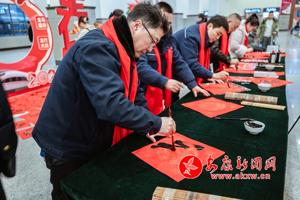 活動(dòng)另一邊,7名來(lái)自安康地區(qū)的鐵路書法家們?cè)诤蜍囀覂?nèi)揮毫潑墨,一氣呵成,將一副副飽含著美好祝愿的春聯(lián)和一張張洋溢著節(jié)日喜慶的“福”字送到旅客手中,讓旅客的春運(yùn)旅途充滿濃濃“年味”。