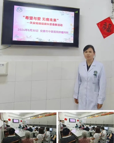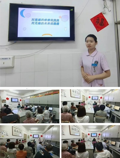 護(hù)士長馬運(yùn)俠以播放癌痛科普視頻的方式,通過臨床疼痛案例深入淺出地將癌痛防治知識(shí)分享給大家,現(xiàn)場與患者進(jìn)行了“話療”,消除他們的緊張情緒,幫助他們樹立抗擊癌痛的信心,科學(xué)的防癌抗癌,受到患者及家屬的一致好評(píng)。