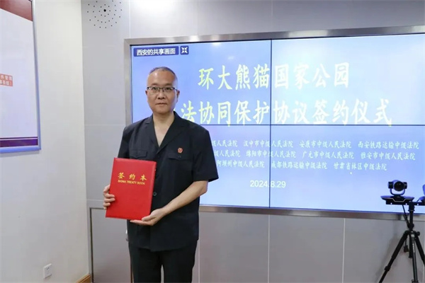 西安市中級人民法院黨組書記、院長趙雷、西安鐵路運(yùn)輸中級法院黨組副書記、副院長王琪軒、四川省成都市中級人民法院黨組成員、副院長謝立新、成都鐵路運(yùn)輸中級法院黨組成員、副院長徐翔、甘肅省林區(qū)中級法院黨組成員、副院長唐開明分別致辭。西安市中級人民法院審判委員會專職委員張曼慧介紹《環(huán)大熊貓國家公園司法協(xié)同保護(hù)協(xié)議》的主要內(nèi)容。