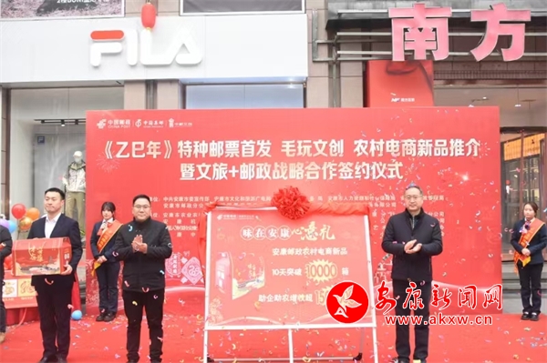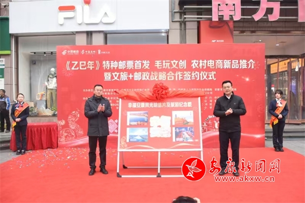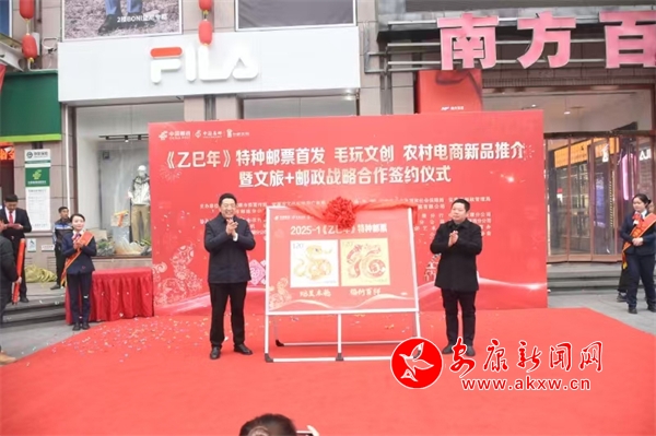 本網(wǎng)訊(通訊員 沈巧苗)龍騰辭舊歲,巳蛇報(bào)春來(lái),1月5日上午9點(diǎn),《乙巳年》特種郵票首發(fā)、生肖毛玩文創(chuàng)、農(nóng)村電商新品推介暨文旅+郵政戰(zhàn)略合作簽約活動(dòng)舉辦,現(xiàn)場(chǎng)參加活動(dòng)人達(dá)300余人。