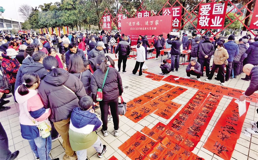 活動現場,人頭攢動,長桌一字擺開,書法家們精神飽滿,手中的毛筆飽蘸濃墨,筆鋒游走間,楷、行、隸、草等多種書體各顯神韻,一副副滿載祝福的春聯、一張張承載希望的“福”字躍然紙上,飽含著濃濃年味兒,寄托著人們對新年的美好憧憬與希望。前來領取春聯的市民絡繹不絕,大家一邊欣賞書法創(chuàng)作,一邊挑選著心儀的春聯內容,現場氣氛熱烈融洽;顒舆將在安康高新區(qū)、西城坊、部分旅游景點等地持續(xù)進行。(記者 陸青波 攝)