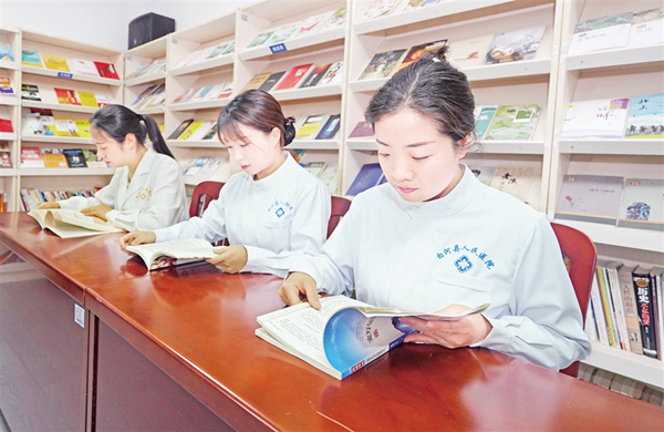 4月23日,白河縣人民醫(yī)院護士利用工作間隙在圖書角專注閱讀。(伍渭康 攝)