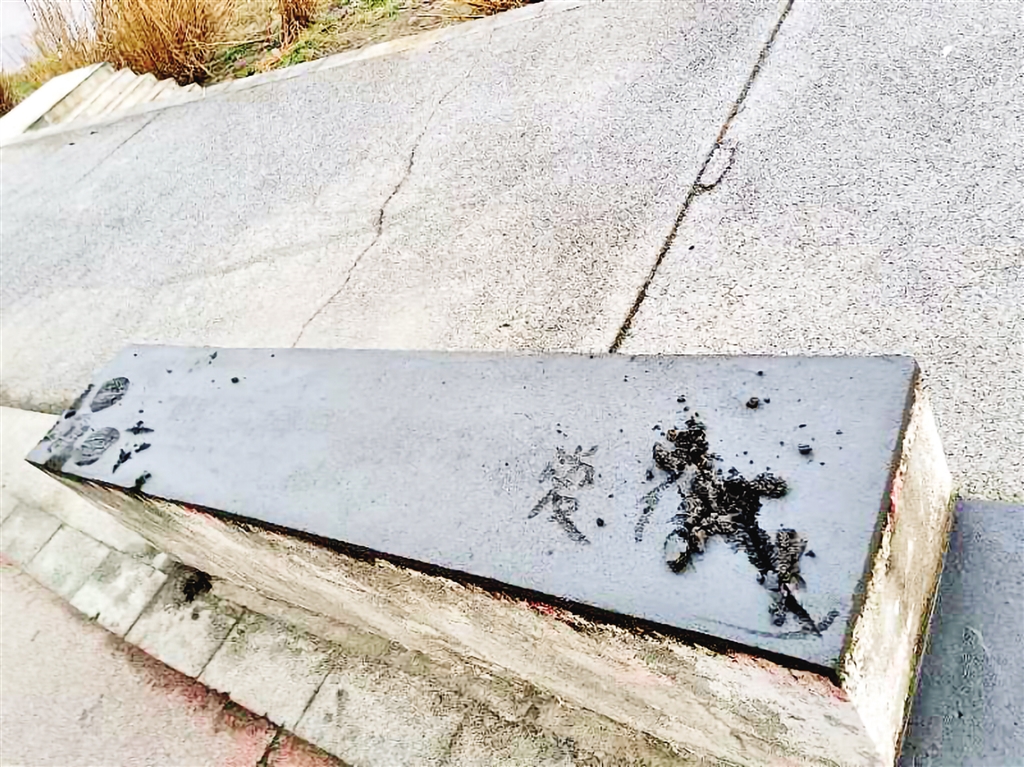清晨跑步途徑江邊步道,一位施工的師傅和江灘公園保潔員說:“在擋護墩上刻字,太不文明了!弊叩礁埃胖朗亲蛱煜挛鐒倓偸┕そY(jié)束的擋護墩,還未完全凝固的……