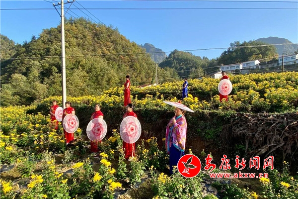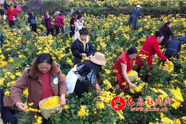 另一邊,百畝金絲黃菊爭(zhēng)相盛放,甚是好看。大家繞著山路健步而行。菊花種植基地里,游客們被花海吸引著,一邊賞花、采摘,一邊不由自主地踏入花海拍照。