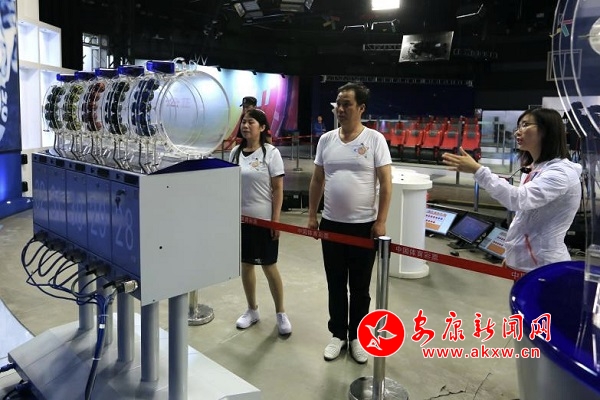 19時(shí),安康觀摩團(tuán)在工作人員的指導(dǎo)下,進(jìn)行了嚴(yán)格有序的安檢工作。每個(gè)人都需要將隨身所帶物品全部放入存儲(chǔ)柜。所有人員安檢結(jié)束后,通過專用通道,憑實(shí)名認(rèn)證的通行證進(jìn)入開獎(jiǎng)直播大廳。待大家整齊落座開獎(jiǎng)直播大廳后,工作人員再次講解注意事項(xiàng),并邀請觀摩團(tuán)收看了開獎(jiǎng)場地介紹、開獎(jiǎng)流程、數(shù)據(jù)封存及搖獎(jiǎng)設(shè)備四個(gè)短視頻。工作人員還將試機(jī)球發(fā)給觀摩團(tuán)成員,讓大家真實(shí)感受搖獎(jiǎng)球的質(zhì)地,四名幸運(yùn)站長被邀請到臺(tái)上零距離參觀搖獎(jiǎng)設(shè)備。