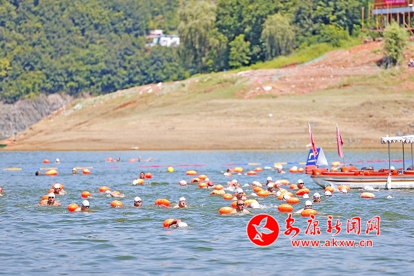 比賽現(xiàn)場(chǎng),選手們你追我趕,在寬廣的湖中盡情體驗(yàn)湖泊暢游的快感,享受著健身運(yùn)動(dòng)帶來的快樂。本次比賽場(chǎng)地選在瀛湖風(fēng)景區(qū)翠屏島湖面,相較于傳統(tǒng)賽道比賽模式,天然水域上的比賽不但是游泳技巧的較量,更是勇氣、毅力、耐力的比拼。