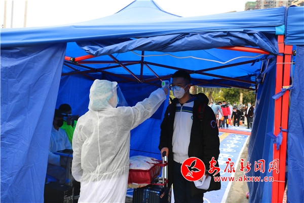 在高新中學(xué)校門口,安保人員、新冠肺炎疫情防控人員及公安、防疫人員早已定點(diǎn)就位,并逐一對(duì)入校的學(xué)生進(jìn)行防控檢查。