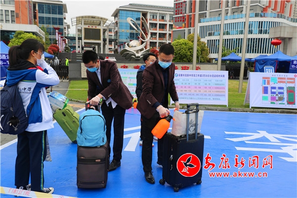 工作人員與老師在校門口有條不紊地開展著校園防疫工作,測(cè)體溫、查看“健康碼”、對(duì)行李及物品進(jìn)行消毒等工作有序進(jìn)行著。學(xué)校高三年級(jí)29個(gè)班、1300多名學(xué)生實(shí)行錯(cuò)峰報(bào)到,在今天早上9點(diǎn)至下午15點(diǎn),分批次從學(xué)校正門的四個(gè)通道進(jìn)入校園。