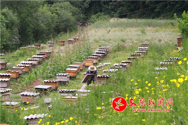 “那個就是老余,我們村中華蜂養(yǎng)殖園和養(yǎng)蜂農(nóng)民專業(yè)合作社的負(fù)責(zé)人......”順著營盤埡村支部書記劉賜堂手指的方向望去,只見一位頭戴防蜂面罩,身著格子襯衣的中年漢子正在花叢中整理蜂箱。