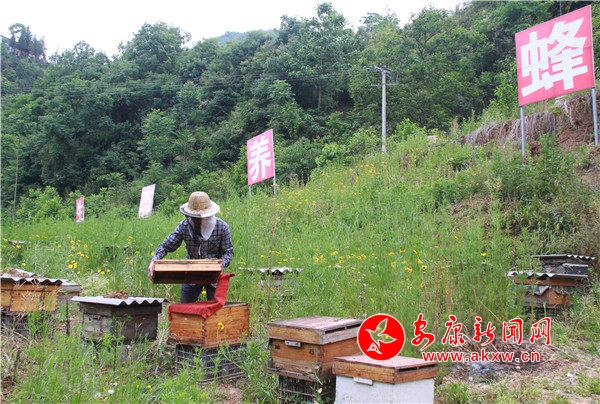 2017年,可以說是余升富養(yǎng)蜂生涯的轉(zhuǎn)折點(diǎn)。漢濱區(qū)林業(yè)局、茨溝鎮(zhèn)林業(yè)站干部帶著茨溝鎮(zhèn)營盤埡村村干部到嵐皋縣花里村余升富的養(yǎng)蜂基地考察養(yǎng)蜂項(xiàng)目,一次性購買了500箱蜜蜂,運(yùn)回了茨溝。同時(shí),還把老余帶到了茨溝鎮(zhèn)參觀指導(dǎo)。