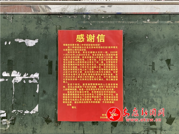 石夢林見義勇為的事跡,直到傷者李先生的感謝信送到學(xué)校,才被大家所知曉。但他覺得這并不是什么大事。“早晨行人比較少,肇事者又逃逸,所以我必須幫助這個老人,否則他的傷勢可能會更加嚴重。”石夢林說,“平時在學(xué)校開班會、年級大會時老師都會教導(dǎo)我們要助人為樂、與人為善,我只是做了我力所能及的事情。”