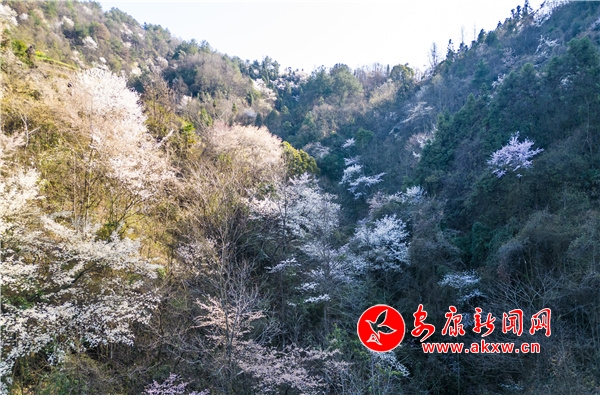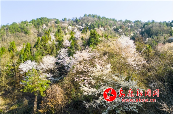 本網(wǎng)訊(記者 李俊 實習(xí)記者 卜昊天)近日,漢濱區(qū)晏壩鎮(zhèn)漫山的野生櫻桃花在和煦的春風(fēng)中競相盛開。遠眺山林,從山腳到山頂次第綻放,山澗幽谷處處粉白,民居藏于其中,宛若世外桃源,起伏的山脈被一簇簇壓滿整個枝頭的櫻桃花所覆蓋。